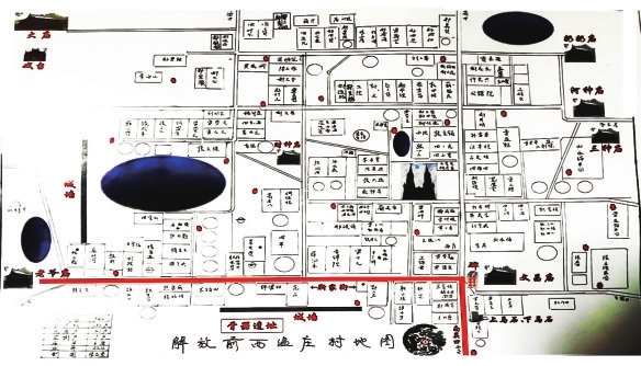 前几年,村民们想挖掘村里的历史,以此开发村里的旅游观光农业,于是组织村里的老人们陈述村里的历史故事,描绘温泉镇的旧时面貌。有人提出能不能画一张村子原来的布局详图。志勇老人二话不说,就承担起了这个任务。记忆力超强的他,凭着小时候的印象,又在村里进行了实地的丈量测绘,花了大半年的时间,详细地画出了西温庄村旧时的村落布局图。这个图是按照绘图规则,依比例严格绘制的,精准地再现了西温庄村的历史状况。不光庙宇池塘等大的标的物标注明显,就连村民的私宅,也都注上了当时户主的姓名。有一些尚未拆除的老宅院,和现在卫星拍下的地图都能比对上。