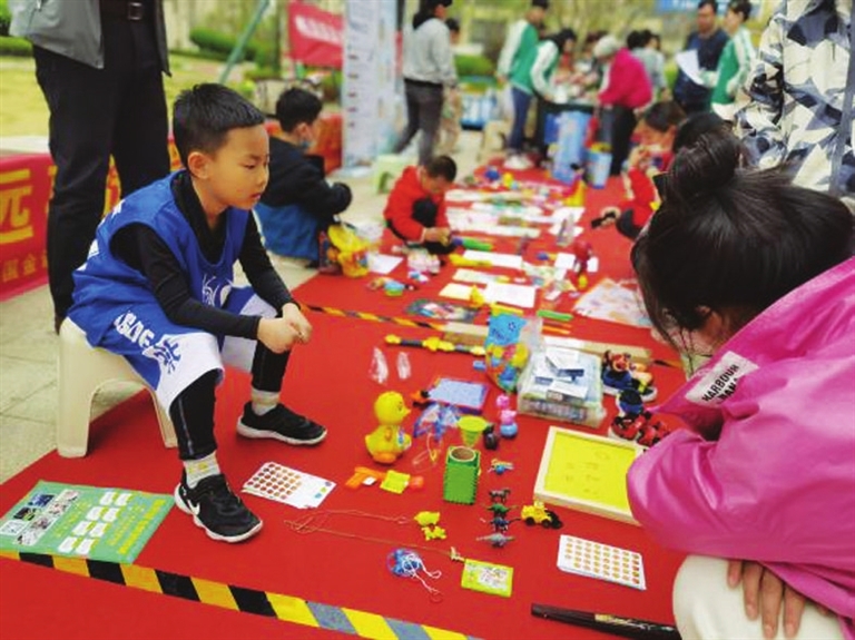 “看看这只鸭子吧,我小时候最喜欢它了,一捏还会叫呢……”孩子们早早布置好摊位,向过往“顾客”介绍自己精心准备的商品。
