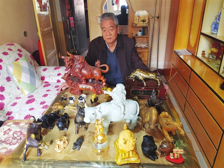 家人介绍,李炎生对牛的造型的收集有些走火入魔。生日蛋糕上的小奶牛造型,他不忍舍弃,银行的牛年挂件,他往家拿。时间长了,家里的“牛”成灾。“就是个这爱好,不管他,由着他来。”