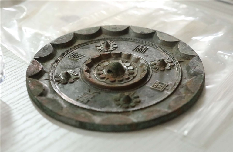 时光并没有带走铜镜的光辉,考古工作者在一座中型墓葬中发现了一件草叶纹镜,当清理掉其上的浮土,镜面虽已斑驳,但仍光可鉴人。