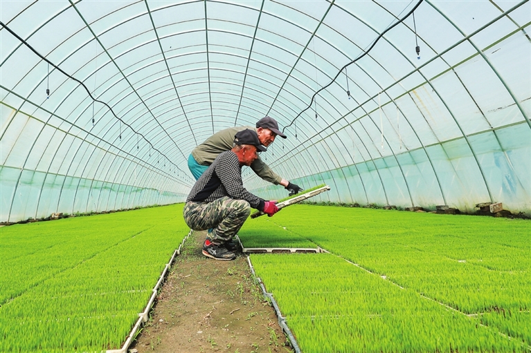 今年育秧开始后,除了继续采用机械化育秧的方式,晋源区还组织农业专家为农户们改良了土壤配方,经过半个多月的忙碌,秧苗的出苗率由去年的80%提高至95%以上,一个大棚的秧苗够85亩稻田的插秧。此外,利用温室大棚育秧,不仅不受时节影响,还能精准控制温度、湿度和土壤基质酸碱度,调整秧苗的生长速度,缩短秧苗生长周期。一般情况下一周时间秧苗就会出土1公分,40天后这些秧苗就将被插进稻田里。由于出苗率高、返青率高、成本低,今年花塔村秧苗订单增加了三成。看着一排排绿油油的秧苗,任福贵高兴地说:“新技术提高了晋祠大米的产量,今年晋祠大米的亩产量有希望突破500公斤。”
