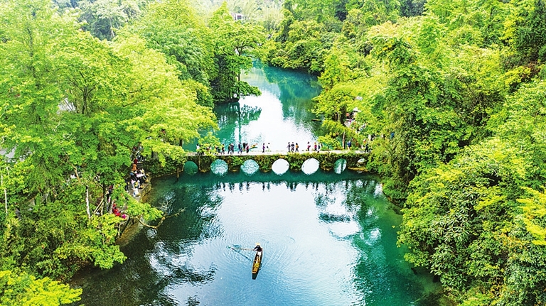 时下,贵州省黔南布依族苗族自治州荔波县樟江风景名胜区的小七孔景区山川毓秀,春景明媚,吸引游客前来观光游玩。 新华社 发