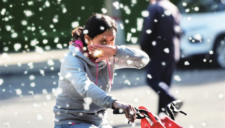 4月18日,在省城千峰路,漫天飞舞的杨絮给市民的出行带来了诸多不便。杨絮不仅使敏感人群诱发过敏疾病,同时容易造成火灾。市民出行应佩戴口罩并注意消防安全。
