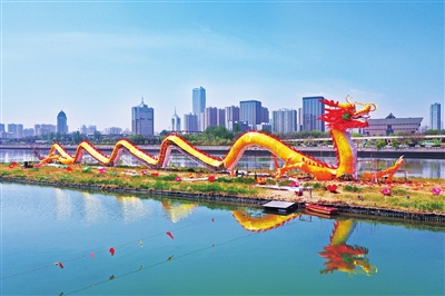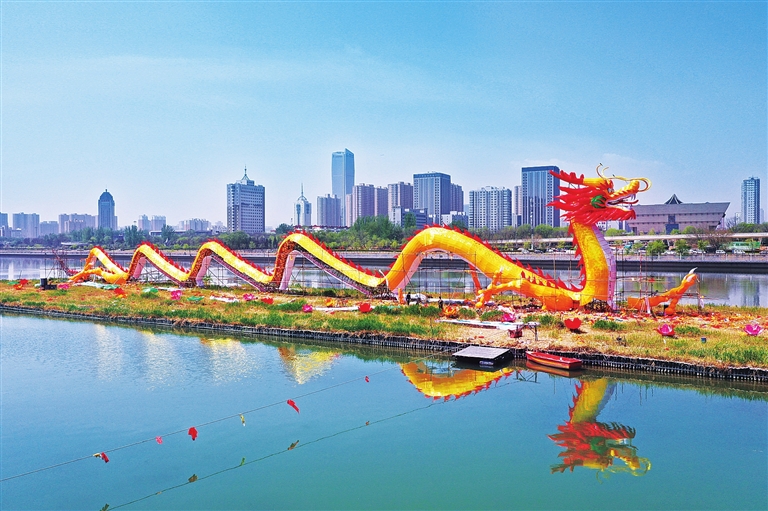 4月19日,彩灯工艺师为汾河景区“中华第一巨龙”换装。每到春季,汾河景区的“巨龙”都要换新装。“巨龙”长126米,龙头高16米,龙身最大跨度20米,最大直径2.7米。据景区管理人员介绍,“巨龙”的整体装饰预计在月底前完工。 全媒体记者 米国伟 摄