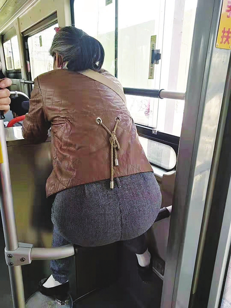 4月15日下午5时许,12路公交车行至彭村公交站时,上来一位女乘客。她见没有空座,径直去到后门,一屁股坐到了车门旁的栏杆上,双脚很自然地踩踏在垃圾筒和侧板上。那个位置紧靠车门,女乘客坐在那儿,不雅观也不安全。如公交车到达下一站,车门打开势必会碰到她。司机第一时间发现,立即要求她从栏杆下来,并提示其注意安全。女乘客闻听,悻悻下来。