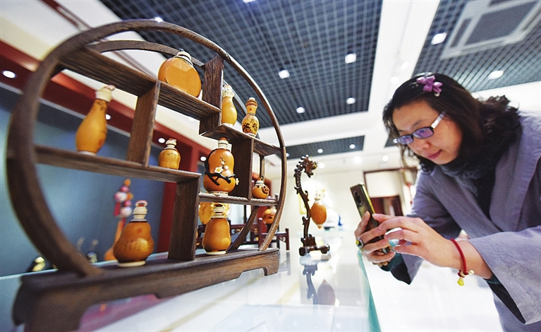 4月19日,太原工艺美术馆内,造型各异、制作精美的葫芦工艺品吸引了众多参观者。