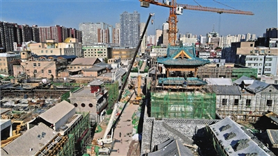 4月20日,修建中的钟楼,基座、楼体和宝顶已完成,现进行建筑外墙喷绘、彩绘装饰作业,曾经太原古老的地标重现可期。目前,钟楼街历史街区改造工程进展顺利,开明照相馆、说书楼旧址、国民日报社旧址、百年邮局等历史建筑的修缮工程都已经基本完成,历史街巷恢复改造正在推进中。钟楼街的修建预计在7月完成,届时,可以通过一个个老字号,感受太原的古老文化历史。