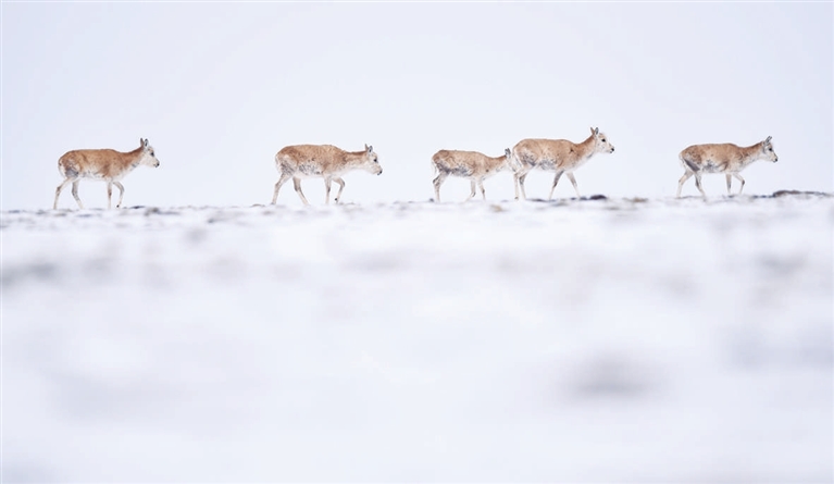 “高原精灵”藏羚羊的迁徙,被称为全球最为壮观的三种有蹄类动物大迁徙之一。每年4月底,藏羚羊逐步汇聚在可可西里五道梁地区,往“大产房”卓乃湖迁徙产仔。 新华社 发