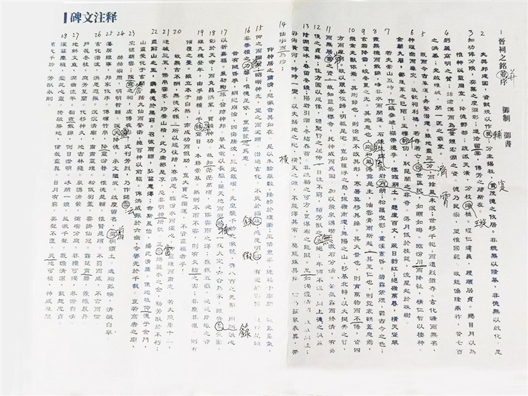 碑文中“资懿亲以作辅”中的“辅”,在注释中变成了“畏”;“玉楼千仞”中的“千”,在注释中变成了“幹”;“则和风溽露是生”中的“则”“风”分别变成了“剛”(刚的繁体字)“鳯”(凤的繁体字)……一一对照,王老师指出该碑文注释中共有21处错误。