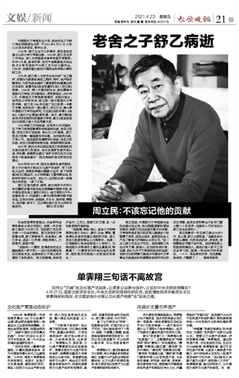 老舍之子舒乙病逝