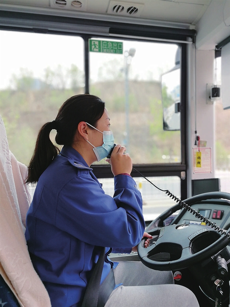 从始发站松庄停车场到终点站学府街党校路口,一路上,李灵利用等红灯的间隙,不仅开展疫情防控和安全宣传,还结合沿途站点做特色播报。