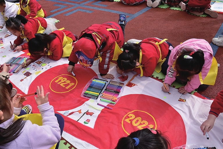有的孩子描绘党徽国旗、祖国山水,有的描绘宇宙星空、花草植物,有的描绘图书世界、田园景象……百米画卷上色彩斑斓,闪耀着孩子们的奇思妙想和创作灵光,记录着孩子们的幸福时光和对祖国的热爱。