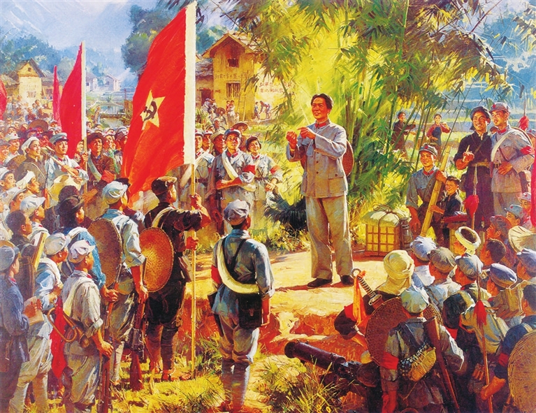 纪律严明、步调一致是我们党的光荣传统和独特优势。井冈山斗争时期逐渐形成的“三大纪律八项注意”,就是我们党领导下的人民军队永葆战斗力的重要保证和经验总结。1974年,由军旅画家彭彬、何孔德、高虹共同创作的油画《步调一致才能得胜利》(尺寸为322×249厘米,现藏于中国美术馆),以生动真实的题材、层次分明的构图、丰富浓烈的色彩,艺术地描绘出毛泽东1928年4月3日站在湖南省桂东县沙田圩“三十六石丘”田边土台上,扳着指头向工农革命军和赤卫队员讲解“三条纪律六项注意”的历史情景。