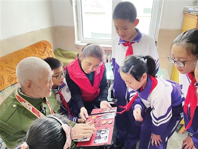当天下午,孩子们登门时,韩爷爷早已穿好军装等候。虽已93岁高龄,但老人思维清晰,当他打开一个盒子时,孩子们都“哇”的一声惊呼起来。盒子里是十几枚大小、形状不一的华北解放纪念章、全国解放纪念章等各类军功章。