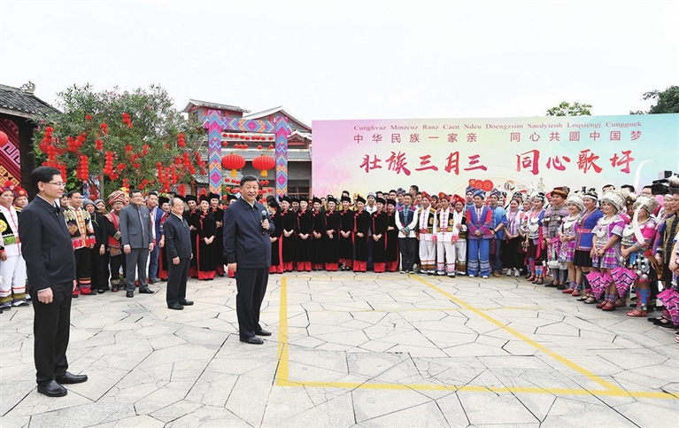 广西是我国少数民族人口最多的自治区。27日上午,习近平来到位于南宁市邕江之畔的广西民族博物馆,参观壮族文化展。博物馆外,三月三“歌圩节”壮族对歌等民族文化活动正在这里集中展示。习近平强调,广西是全国民族团结进步示范区,要继续发挥好示范带动作用。各民族共同团结进步、共同繁荣发展是中华民族的生命所在、力量所在、希望所在,在全面建设社会主义现代化国家的新征程上,一个民族都不能少,各族人民要心手相牵、团结奋进,共创中华民族的美好未来,共享民族复兴的伟大荣光。