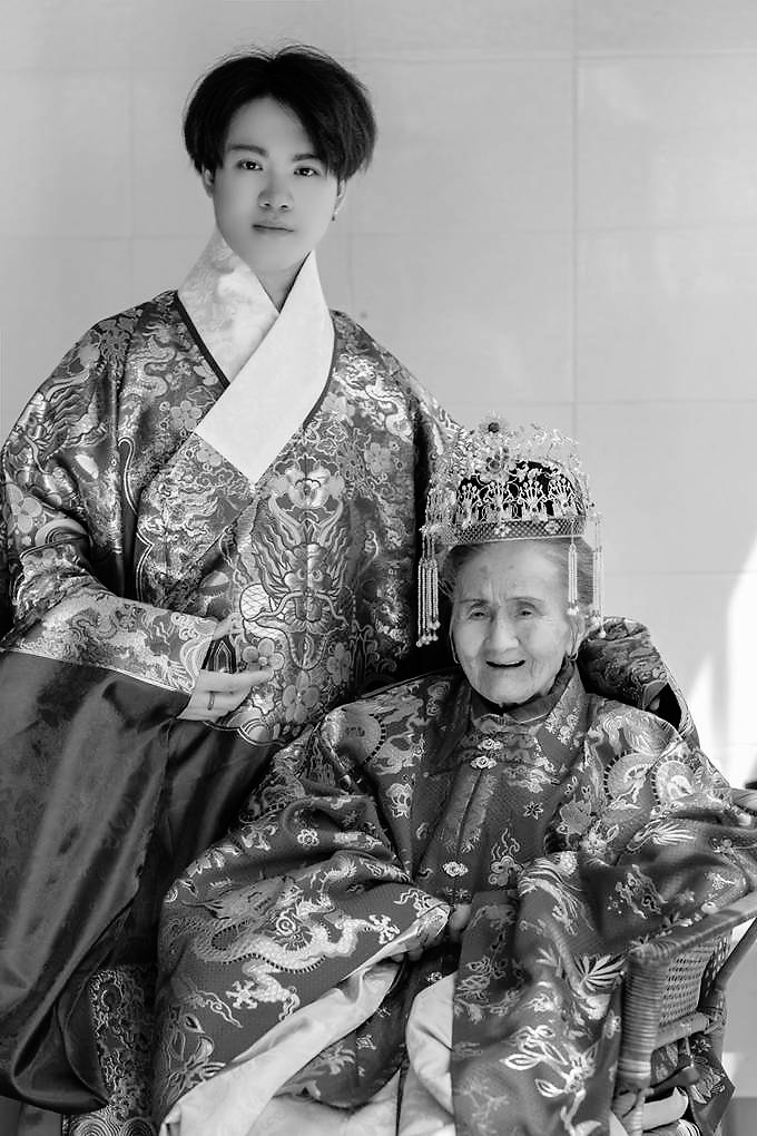 谈到为曾祖母拍摄汉服照的原因,周景洁表示,从他懂事时就知道曾祖母喜欢漂亮的衣服,特别是传统的服饰,“2019年底,曾祖母意外摔断了腿,我想哄曾祖母开心,也想给她留一份美好的回忆,就想到了为她拍摄一组汉服照。”2020年3月,在曾祖母的腿伤好了以后,周景洁为她拍摄了第一套汉服照,“第一次拍摄时,我特地花了1万元定制了一套‘九阳开泰’的汉服。”