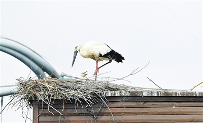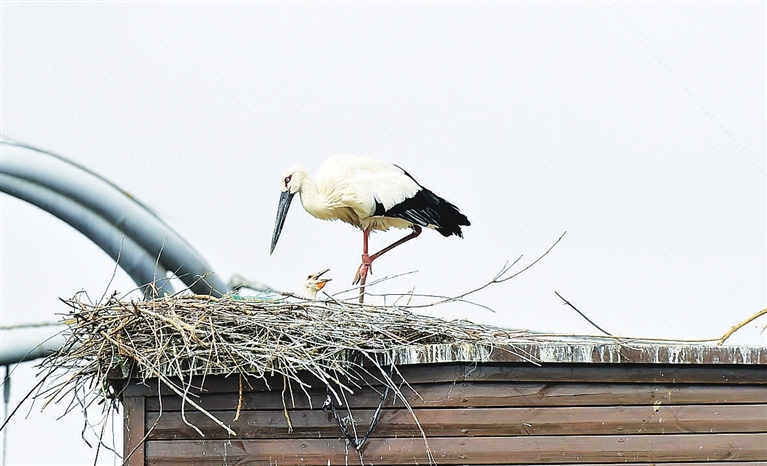 今年2月起,饲养员发现百鸟苑里的东方白鹳、苍鹭、蓝孔雀、赤麻鸭等鸟类开始成对活动,结合配偶后雌雄鸟便开始共同建巢、产卵、孵化。