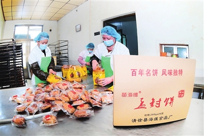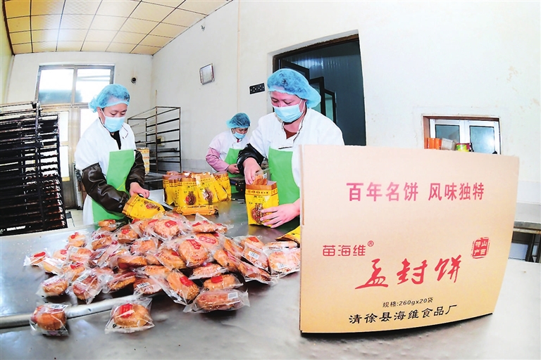 孟封饼是清徐县孟封镇独特的传统名优特产食品。其配料制作讲究,吃起来甜而不腻、酥而不碎、凉而不冷,放在口里不嚼自化,现吃久放,滋味常鲜,色香诱人。据传,孟封饼始制于清光绪十年。当时,孟封镇里旺村有一家姓冯的财主,雇用厨师赵晋山。当年腊月,冯财主要求:一月之内顿顿要求变花样。尽管赵晋山手艺高,也被逼得技穷艺尽,在厨房苦思变什么花样,不慎碰翻了面案旁的油篓,便急忙把油收到面缸中加面制饼,不料油太多面太稀,无法形成饼状,只好用铲子铲块放在鏊上扣锅烤熟,恰巧冯财主到厨房察看,见做成的几块疙瘩后生气地问:“做的这唤甚啦?”赵厨师急中生智说:“这是专门为您特制的锅块。”冯财主一尝,甜香酥脆,要求继续烤制。赵晋山反复试验,确定四油四糖的最佳配方。后赵晋山开设饼铺,当时叫“孟封锅块”。孟封是京(北京)西(西安)大官道的必经之处。南北客商不断,加之“锅块”风味别具,来往客商必携带而去,为称呼方便,又因是在孟封买的,所以就叫成“孟封饼”了。1900年,八国联军进攻北京,慈禧太后、光绪皇帝逃往西安,路经徐沟时,徐沟县令用地方小吃招待,其中就有孟封饼,慈禧太后尝后很是赞赏,随即传口谕取孟封饼三担,此事使孟封饼名声大震、远扬京都,行销到京、津、冀、陕等地。上世纪六七十年代,太原、晋中副食店多挂有“孟封饼”的牌号,成品常年陈列,到中秋、春节更是随处可见,百年来盛名不衰。2011年6月,孟封饼被确定为省级非物质文化遗产保护项目。在海维食品厂的制作车间,只见工人师傅提面粉,揉面团,依次切开,抹一把油酥涂上面饼,刷一层蛋液撒一撮芝麻,搓条,下剂,按扁,包酥,烤炉里的那抹金黄冒出欢快的滋滋声,让人充满念想。一只小小的饼,浸染了几代人的记忆。