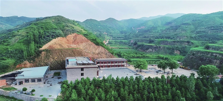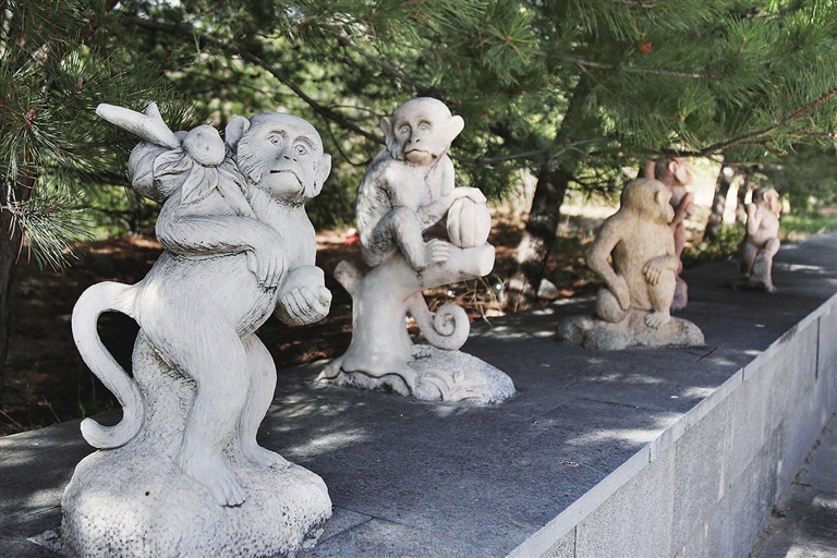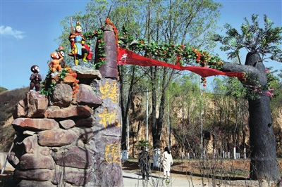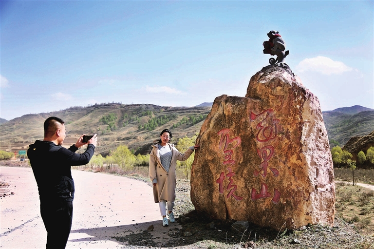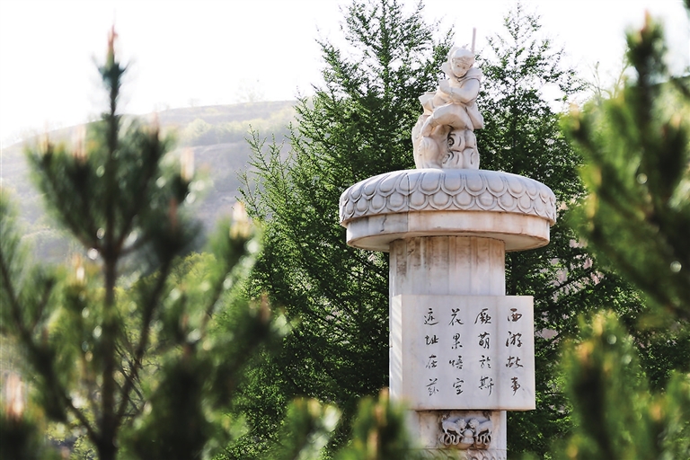 进门不远,迎面立着刻有孙悟空形象的“孕石”,还有唐僧师徒取经的形象。道路两旁,人们热火朝天地拿着铁锹挖坑植树;山坡上,一群群学生、居民纷纷将写有自己姓名的绿色认领牌拴到认养的果树上,有空就可以来照料树木,等待收获丰收的果实。