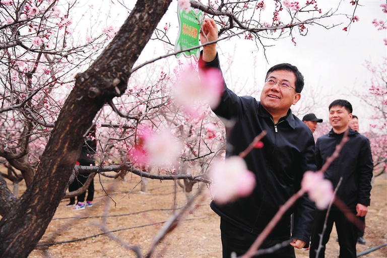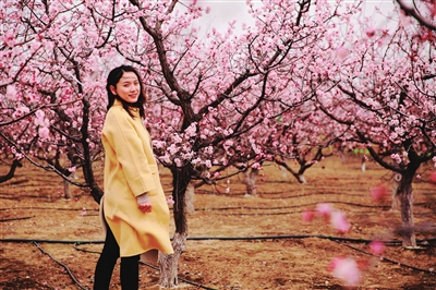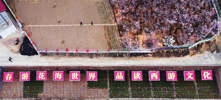 娄烦县城西南,沿着339国道一路行驶至潘家庄村红花渠,便看到一个有孙悟空彩塑的树形大门,上面写着“蟠桃园”三个大字。从门口沿着山路蜿蜒行进,两旁树木吐翠,生机勃勃。山中层层叠叠的梯田地里白色的梨花、杏花和粉红色的桃花争相怒放,如云似霞,散发出一阵阵浓郁的花香,惹得人们竞相拍照、流连忘返。来到园区广场,大红灯笼高挂,各色彩旗飘扬,“春游花海世界 品读西游文化”的主题标语分外醒目,这里就是娄烦县马家庄乡全力打造的“西游记”主题景区。