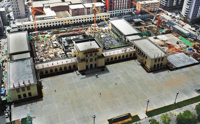 5月8日,太原工人文化宫北侧外立面改造一新,正在进行南侧主体工程建设。改造结束后将提升迎泽大街沿线建筑风貌,成为一流的市民文化广场和重要的会议活动中心。 邓寅明 摄