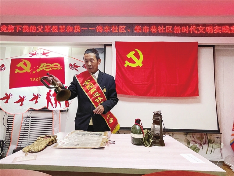 当日上午,柴市巷社区活动现场,杨贵山老人将学党史与前一段时间,参观中央红军长征出发纪念馆、遵义会议纪念馆的感受相结合,与大家一起分享心得体会。杨贵山老人还特意带上革命先辈长征时用的水壶、草鞋、背包等道具,让大家身临其境,深刻地体会到长征时,革命先辈的顽强意志和艰苦奋斗的精神。之后,柴市巷社区两名青年党员分别进行了“党旗下我的父辈、祖辈和我”为主题的宣讲。他们结合自己的工作,情真意切,声情并茂,深深打动了在场每个人的心。