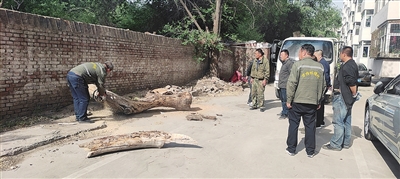 由于社区无专业人员能处理此事,社区干部将此事上报兴华街道。兴华街道立即协调联系了万柏林区绿化队。5月9日,万柏林区绿化队的工作人员放弃休息时间,对枯树进行了处理,彻底消除了安全隐患。
