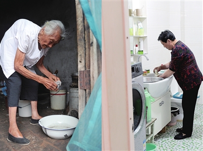 这是一张拼版照片,左图为2011年8月18日,许张氏在准备给儿子许金义清洗身子所用的毛巾;右图为2021年5月7日,许长荣在准备热水给许金义洗头。