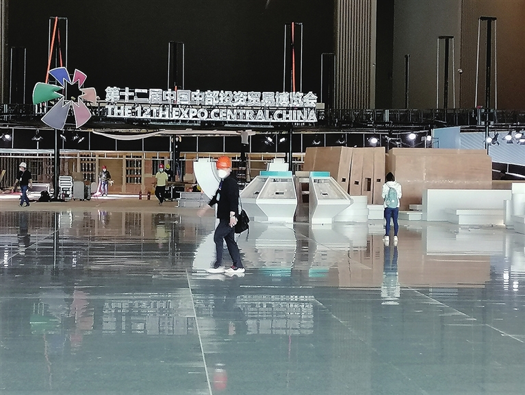 记者来到主展馆的正门,站在大门口向里面看去,大厅里也是忙碌的场景。正对面,“第十二届中国中部投资贸易博览会”中英文字样很是显眼。大字旁边,六色花瓣组合而成的中部博览会会徽已经“盛开”在半空中。“六色花”之下,各种造型的展区部件正在被组合安装,庄重大气的展区显露气势。一名工作人员告诉记者,这里相当于主展馆的门面,一定会精心设计、布置,要让参展的人士一进来就有眼前一亮的感觉。