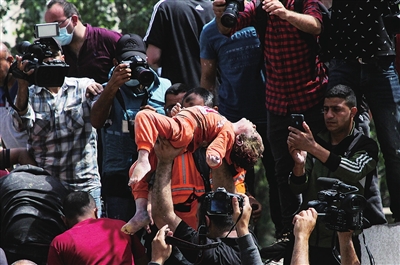5月16日,巴勒斯坦民防人员从被炸住宅楼的废墟中救出一名儿童。加沙地带卫生部门发言人齐德拉说,以色列战机当天凌晨轰炸加沙城中部一处住宅楼,造成33人死亡、50人受伤,死者中包括12名妇女和8名儿童。 新华社 发
