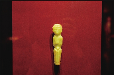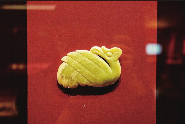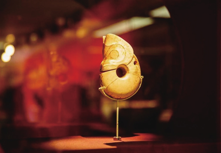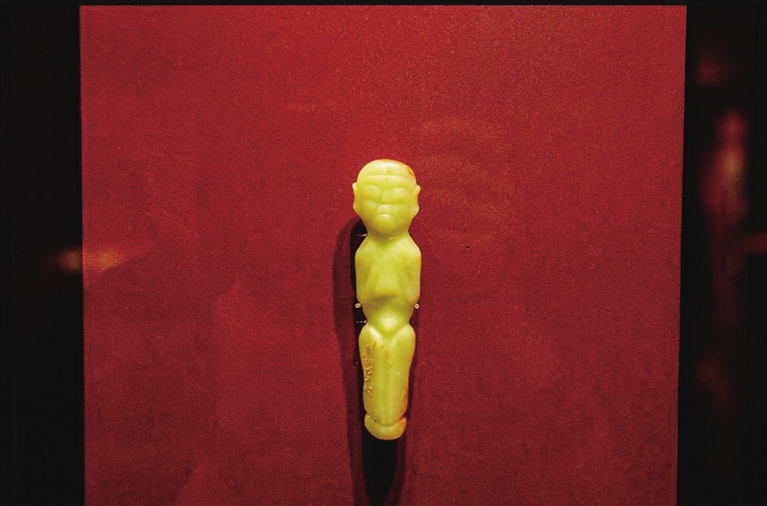 策展人梁芳介绍,玉龙是红山文化最具代表性的玉器,主要有两种形制:一种躯体是C形,头部似鹿,附长脊,另一种躯体是玦形,头部似猪或熊。展厅入口的玉玦形龙,是此类龙形玉器中体型较大、形制规整、唯一雕有牙齿的一件。整器为鸡骨白色,局部有黄色土沁,猪首龙体蜷曲如玦,首尾相连未断,通体浑厚圆滑,造型粗犷。摆放在玉玦形龙两侧的玉斜口桶形器、玉勾云形器,也是展览的重点文物。并排放置的玉人和玉凤,各具特色。玉人为立姿,头部方圆,双眼半合,嘴微张,双手立于胸前,呈站立祈祷状。玉凤为淡绿色,通体抛光,凤鸟为卧姿回首状,高冠、曲颈,圆睛,长喙前端钩曲,与翅羽相接,线条流畅,生动传神。