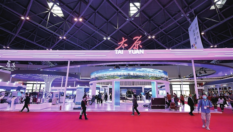 蓝色的光柱,不断闪现转型综改等字样,短波红外芯片、快乐驾车载智能终端等产品外绕着光柱,引来众多关注,使得这里成为人气最高的地方。这里是山西综改示范区展示区。