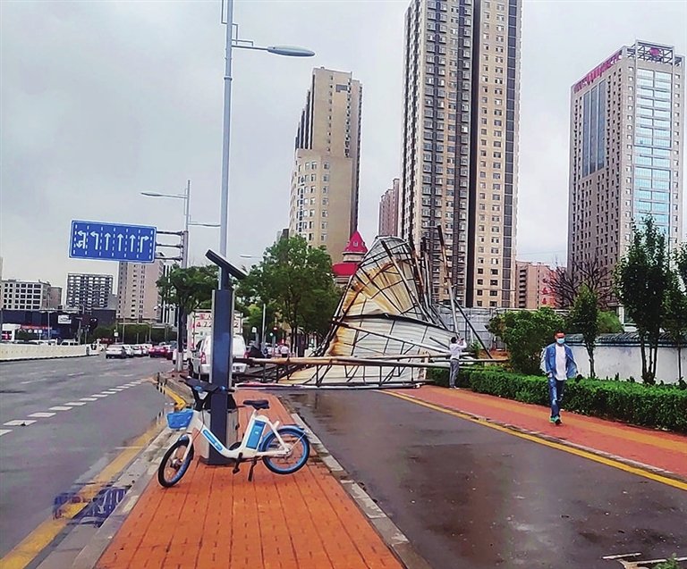 上午11时许,伴随着猛烈的大风,位于晋阳街平阳路口的一处临时围挡没有经受住“考验”,被大风“推”倒在地。记者在现场看到,被吹倒的围挡有约5米长,倾倒在相邻的非机动车上,将人行道和非机动车道完全占据。路人赵先生介绍,当时他就在挡板附近,还计划躲在挡板旁避风,还没过去,挡板就被吹倒了。“片状的挡板,在大风中就像一张纸,疯狂地摆动,所幸挡板的一头没有与其他挡板彻底脱离,产生的位移相对有限,否则真担心它们会被风吹走。”赵先生说。