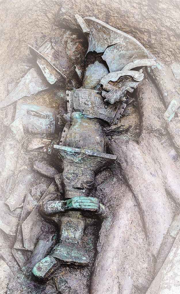 据了解,去年下半年开始的三星堆三号至八号“祭祀坑”发掘工作进展顺利。目前主要进展如下:三号“祭祀坑”埋藏文物以青铜器与象牙为主,两者数量均已超过100件,包括铜顶尊人像、圆口方尊、铜顶坛人像、青铜神树、大型青铜面具等,此外还发现了玉石器、金器、海贝等遗物。其中大型青铜面具宽135厘米、高74厘米,一件青铜器为立人双手上举顶着方坛造型。另有一件铜顶尊人像非常罕见,通高115厘米,下部为一尊跪坐的铜人,双手合握于身前,头部顶一块方板,方板连接青铜大口尊,尊的肩部有精美的龙形装饰。