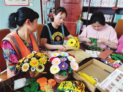 当天上午,十多名巾帼志愿者来到社区,用早已准备好的彩纸、胶条、剪刀和卡纸,跟随社区党总支副书记白志莹制作太阳花。在大家的巧手下,色彩缤纷的卡纸变为栩栩如生的花朵,再经过修剪和装篮,漂亮的手工花篮让人爱不释手。