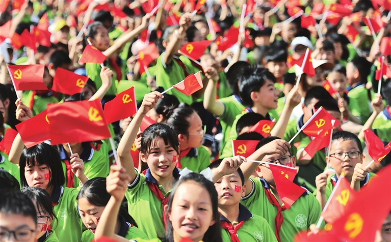 合唱《中国中国鲜红的太阳永不落》《祖国在我心窝窝》等充满朝气,表达了少年儿童对祖国的热爱;体验剧《一条小船诞生一个大党》慷慨激昂,再现了红船上坚定的理想信念;器乐表演《我和我的祖国》《恒大校歌》《七色光》生动活泼,展现出孩子们感恩伟大祖国珍惜美好生活的喜悦。现场还邀请了90岁高龄的老红军薛永新,为孩子们讲述了炮火连天的岁月里那些珍贵的记忆。