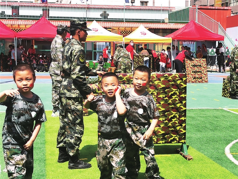 当天上午,小朋友们穿着迷彩服,在老师和军事教官的带领下,参加了升国旗仪式和阅兵式。独木桥、滚轴、地桩网、攀爬架……教官在操场上摆好了“迷你版”的军事障碍器材,操场外的孩子早已跃跃欲试。“下一个项目是由大一班的小朋友带来的军事障碍表演。”听到哨声,小朋友们排队踏上独木桥,接着从地桩网下快速爬过,随后依次越过攀爬架,跳过滚轴,才算完成了一轮军事障碍表演。整个过程中,虽有磕碰,但孩子们脸上依然洋溢着开心的笑容。在操场另一侧,中班的小朋友展示了投掷“手榴弹”。“准备、投弹、抱头……”在教官的指挥下,大家做得有模有样。