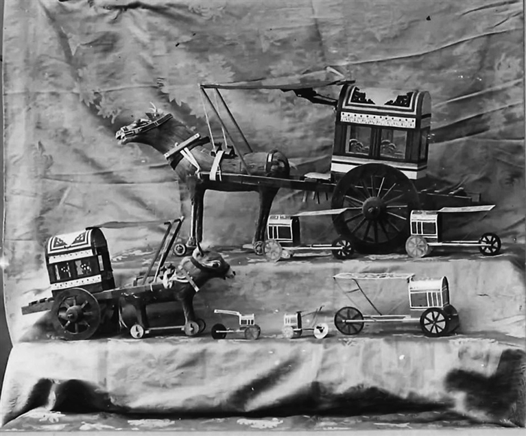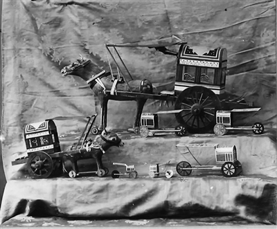 和现代孩子一样,清末的孩子们也有玩具。虽然没有奥特曼、变形金刚、芭比娃娃,但在孩子们眼中,玩具一点儿不贫乏。空竹、陀螺、风车、羊拐、泥人、兔儿爷、拨浪鼓、走马灯、黏土做的哨子、木头和黏土制成的玩具车,中国官员的家里还有给孩子玩的成套积木,积木可以拼出“凿壁借光”“李白捉月”等典故的图形……