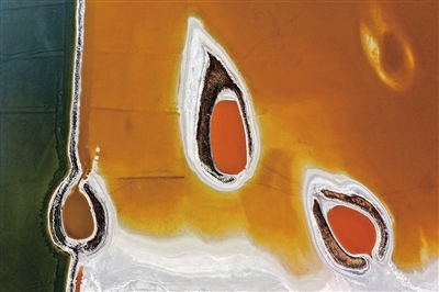 近日,随着气温不断升高,山西运城盐湖呈现五彩斑斓的景象。新华社 发