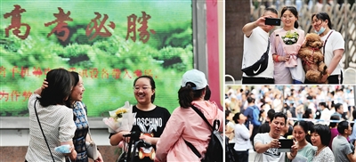 6月8日下午5时,2021年高考结束。按照全省统一安排,高考工作将进入评卷、志愿填报、录取等阶段。图为太原十二中考场外,家长为考生送上鲜花,合影留念。