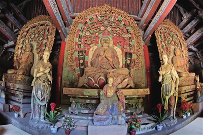 多福寺现存建筑包括三进院落。进山门后,正面是重檐歇山顶、气宇森严的大雄宝殿,是山西明代木结构建筑与官式建筑源流关系的实例。殿内最光彩照人的是中间两尊胁侍菩萨,长身玉立,端庄秀美而无一丝俗媚之态,衣褶近百条,迂回贴体,竟无一重复。两尊彩塑栩栩如生,神态自在,宛若地道山西姑娘,令人叫绝。主像后塑有倒坐观音一尊,也是明代杰作。大殿墙壁绘有84幅连环画,反映了释迦牟尼佛的生平事迹,画法娴熟,线条流畅,着色讲究,立体感强,形象逼真,是难得的明代壁画精品。