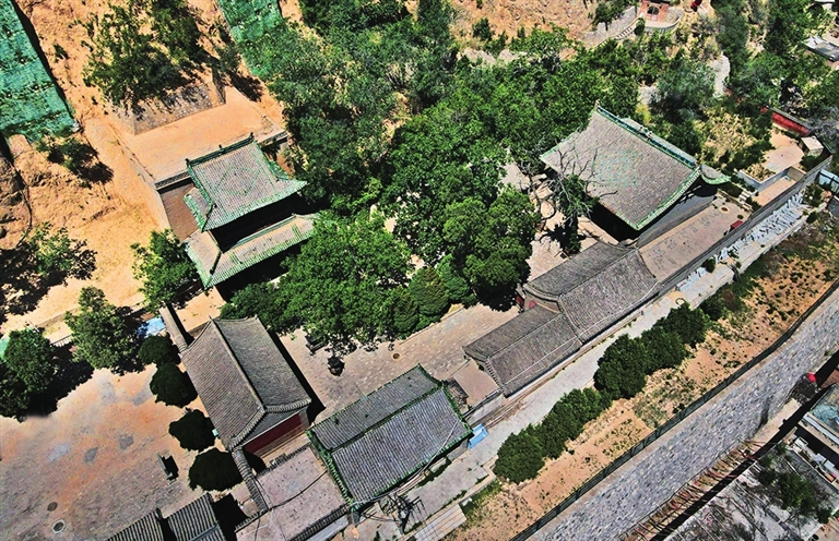 二进院正面为藏经楼,东侧是文殊阁,西侧是黑龙殿。文殊阁下石砌窑洞为傅山读书处,俗称红叶洞,洞前石壁上傅山遗墨犹存。三进院落主要建筑为千佛殿。