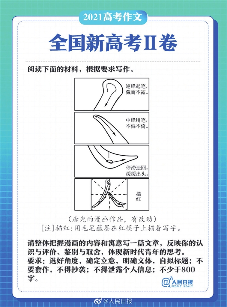 今年全国新高考II卷选用了一幅漫画,要求学生据此写一篇文章,该漫画为“人”字的写作过程,起笔时“逆锋起笔,藏而不露”。写捺时“中锋用笔,不偏不倚”,落笔时“停滞迂回,缓缓出头”,最后一个完整的人字字帖,提示学生“描红”。考卷上显示,该漫画由漫画家唐光雨绘制,有部分改动。