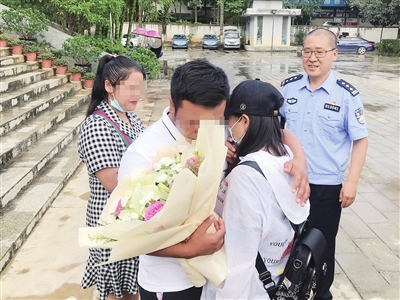 大巴停在当地公安局门前,小袁的弟弟、妹妹及专程从山东赶回来的母亲手捧鲜花,驻足等候。小袁走下车,与家人对视了几秒钟,一家人便紧紧拥抱在一起,一句话没说,相思和牵挂都化作眼泪簌簌而下……