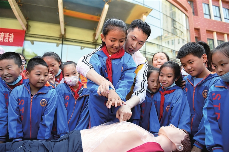 6月10日,在双北小学开展的“小手拉大手 安全你我他”安全教育系列活动中,模拟灾害现场,有效地开展防灾减灾安全教育活动,不断提高全校师生的安全意识和应对突发事件的避险自救能力。 全媒体记者 米国伟 摄