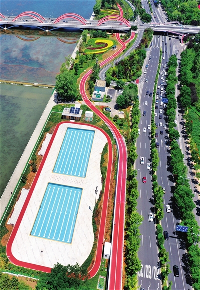 6月11日,改建后的汾河景区露天游泳场格外亮眼。自今年3月开始改建,露天游泳场主体已完工,正在进行配套设施建设。建成后,将给市民提供一个标准更高、环境更优美的健身娱乐场所。 邓寅明 摄