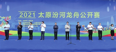汾河晋阳桥段,河面波光粼粼,画舫古朴典雅,晋阳桥雄伟绚丽,彩色的龙舟整齐排列。上午9时许,伴随着雄壮的中华人民共和国国歌,2021太原汾河龙舟公开赛开幕仪式在水上运动中心举行。罗清宇、张新伟与省、市有关领导移步码头,手执毛笔,蘸取碟中朱砂,为龙舟披红点睛,祝愿我们伟大的中国共产党青春永驻、更加辉煌,伟大的祖国风调雨顺、繁荣昌盛,伟大的人民幸福安康、吉祥如意。随后,罗清宇宣布“2021太原汾河龙舟公开赛开幕”。在气势磅礴的威风锣鼓声中,巨龙翻飞,金狮狂舞。随着一声令下,狭窄细长、轻巧灵便的龙舟,如离弦之箭疾射而出,伴随着嘹亮的口号,在鼓点急催下奋力冲向终点,呈现出一幅“汾河碧透,百舸争流”的精彩画面。