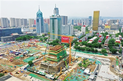 6月16日,五一广场首义门主体工程在建设中。首义门的结构设计独具匠心,下部城台为混凝土浇筑,上部为纯木结构,工艺采用的是中国传统的榫卯结构。目前,首义门城台建设和部分大木构件已基本完成,正在铺设城台城墙砖。