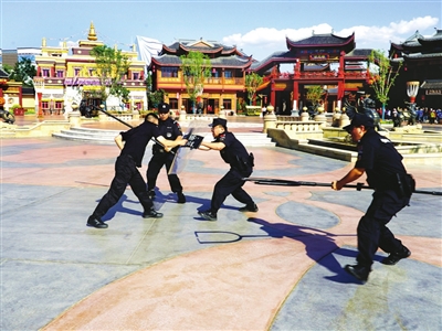 演练假设两名“犯罪分子”在方特中心广场“持刀袭击”群众。园区保安发现后第一时间报警,阳曲县公安局指挥中心立即指派巡警大队最小作战单元赶赴现场处置。民警到场后,手持盾牌、钢叉、警棍将“犯罪分子”围堵,同时进行语言警告。当“犯罪分子”拒不服从并持刀挥砍时,民警立即使用盾牌将其撞倒,使用钢叉将其控制……