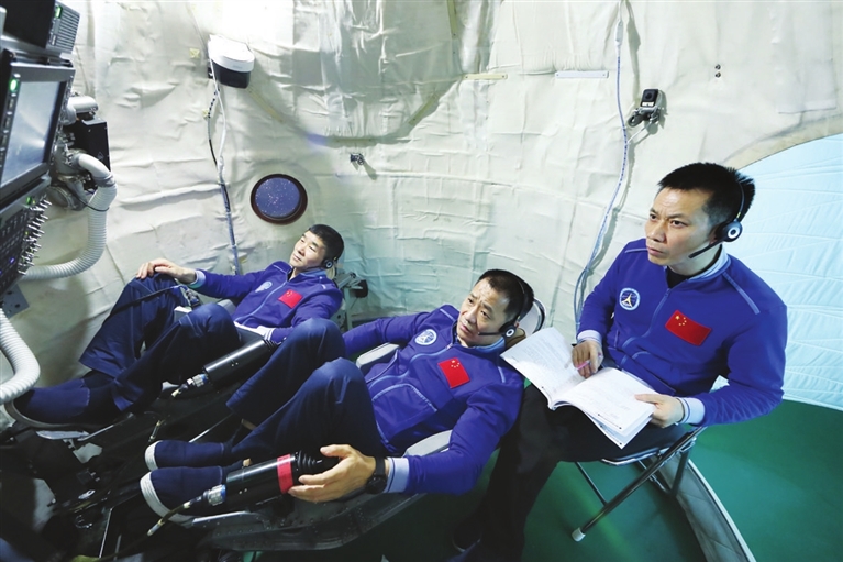 航天员聂海胜(中)、刘伯明(左)和汤洪波在进行交会对接训练(5月15日摄)。